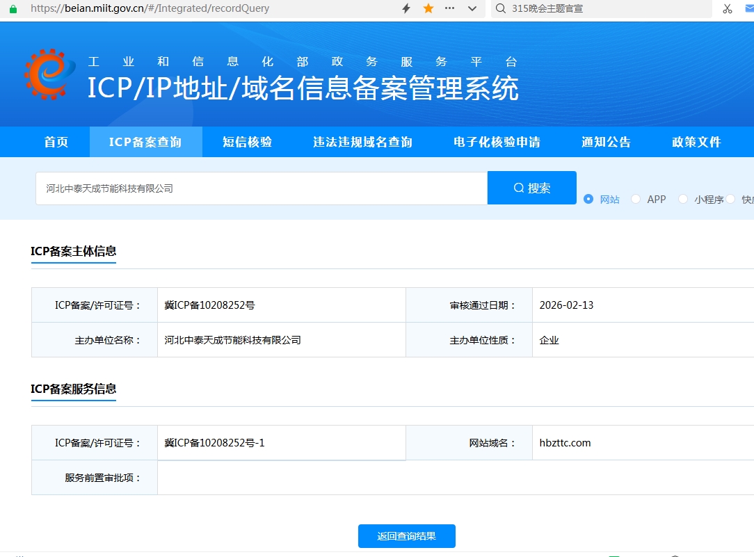河北中泰天成官网备案网站域名:hbzttc.com |